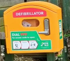 Defib, housed within a 'DefibCaddy' cabinet (the yellow box).
